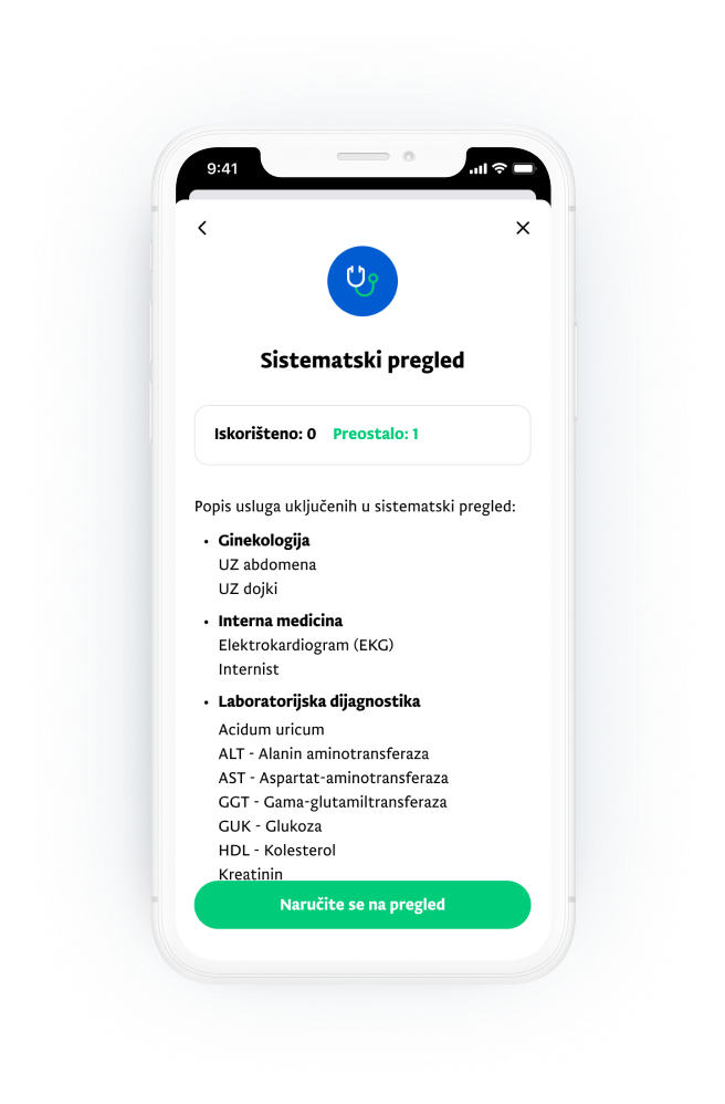 Naručite se na pregled koristeći pogodnosti svoje police Dodatnog zdravstvenog osiguranja. U samo nekoliko klikova odaberite željenu ustanovu i termin i u potpunosti dogovorite sistematski pregled putem aplikacije.